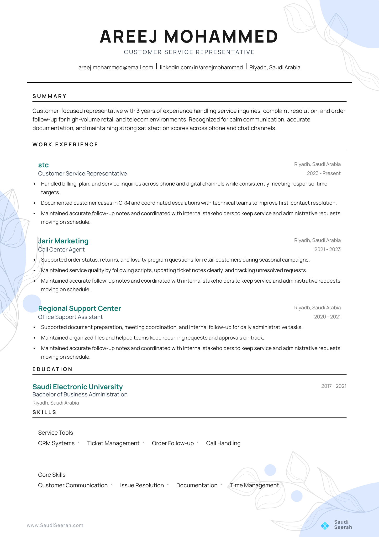 أمثلة عملية لأدوار الدعم الإداري وخدمة العملاء مع تنسيقات واضحة ومباشرة تناسب الشركات السعودية.